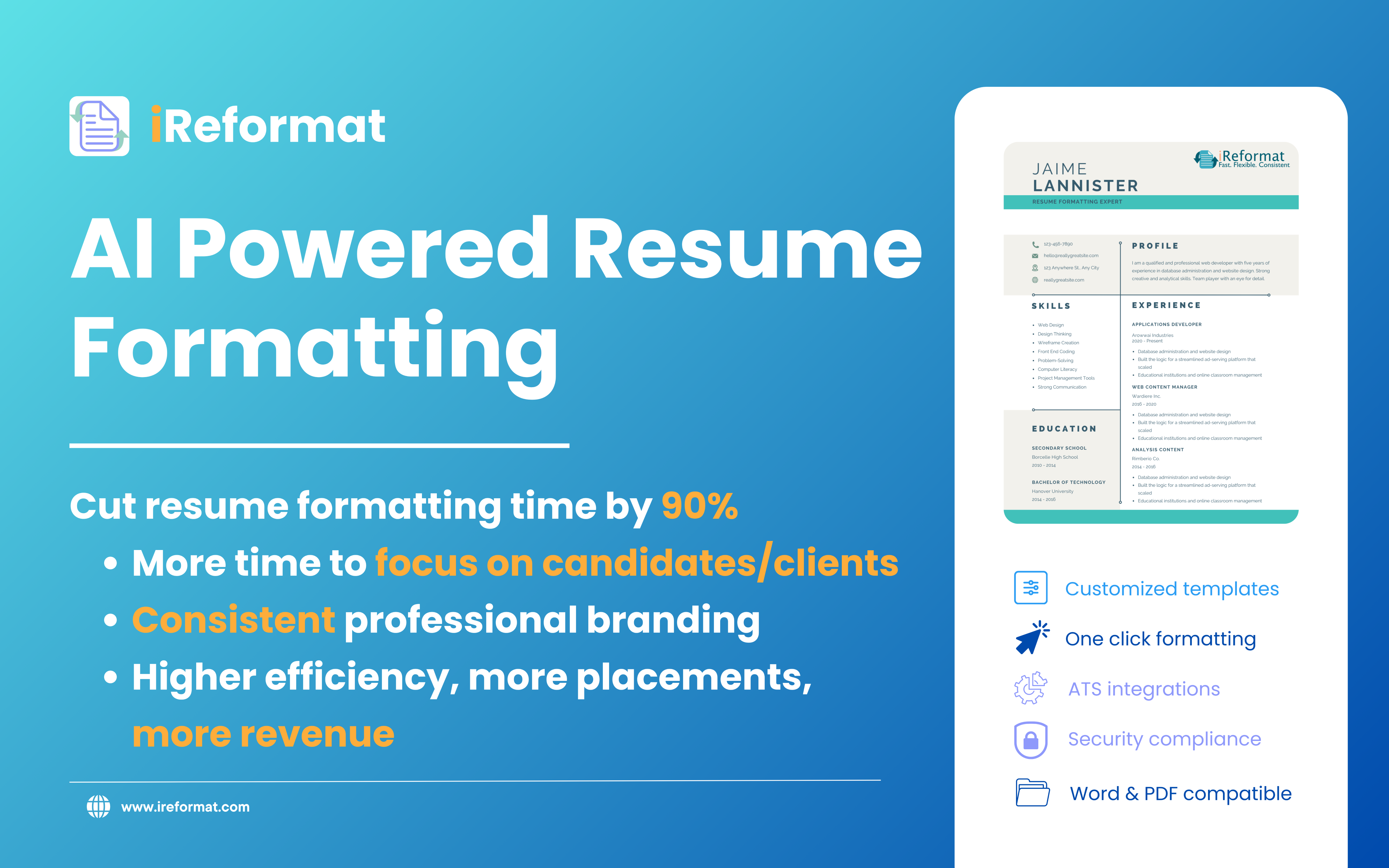 An AI powered resume formatting tool that cuts down resume formatting time by 90% for staffing agencies and recruiters. More efficient organizations are able to use this extra time to focus on what matters - candidate sourcing and client satisfaction - which ultimately leads to more placements and higher revenue generation.