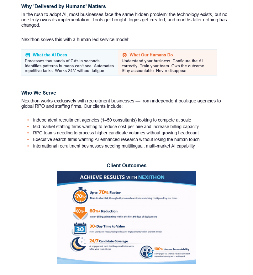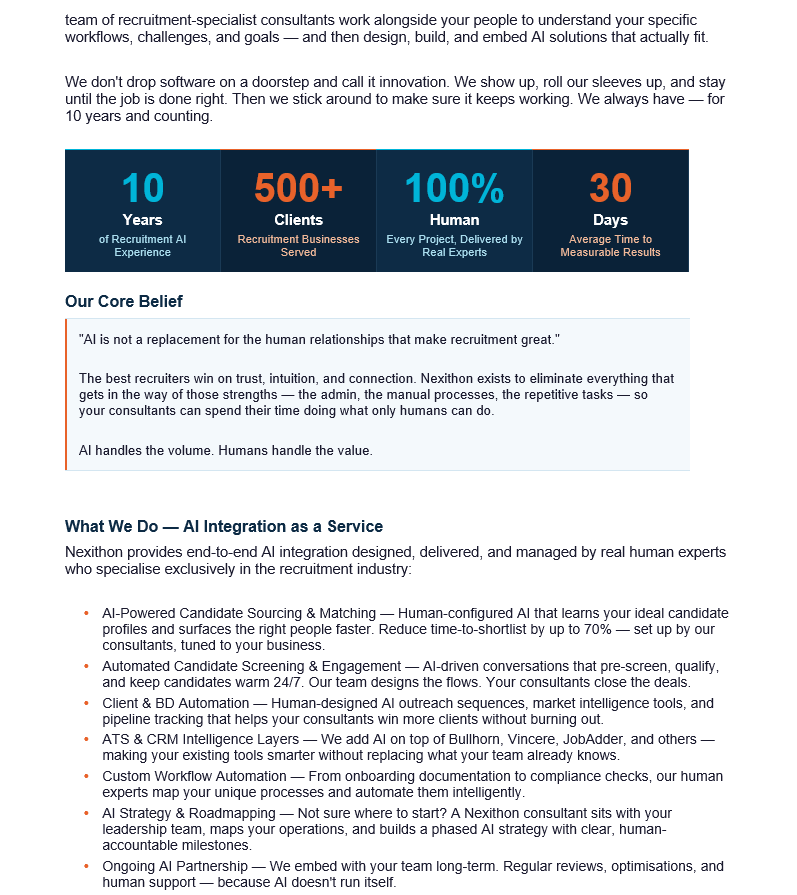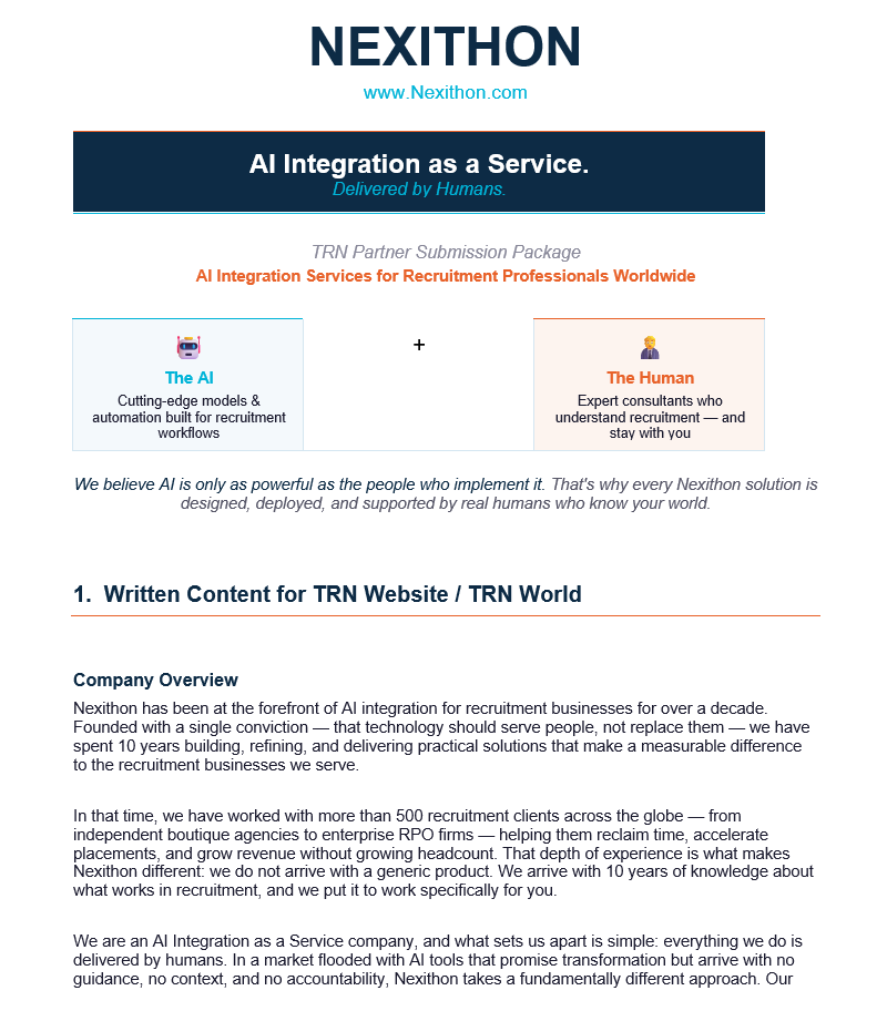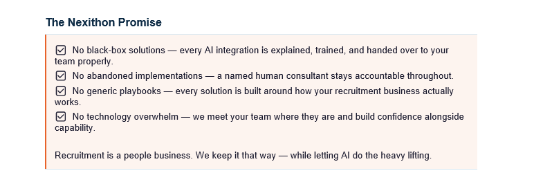 Nexithon provides human-led AI integration services that help recruitment businesses automate processes, improve efficiency, and boost placements without replacing their existing teams or systems.